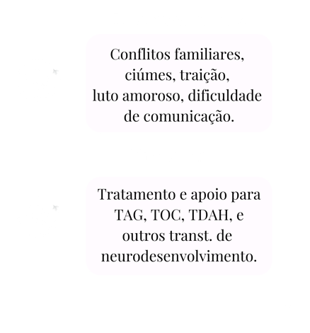 Com uma formação acadêmica sólida, sou psicóloga há 11 anos, com especialização em Terapia Cognitivo-Comportamental (TCC), uma abordagem comprovada para lidar com desafios emocionais e comportamentais. Além disso, busquei me aprofundar em áreas complementares para oferecer um atendimento mais completo e assertivo aos meus pacientes.